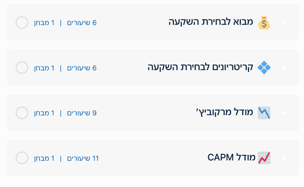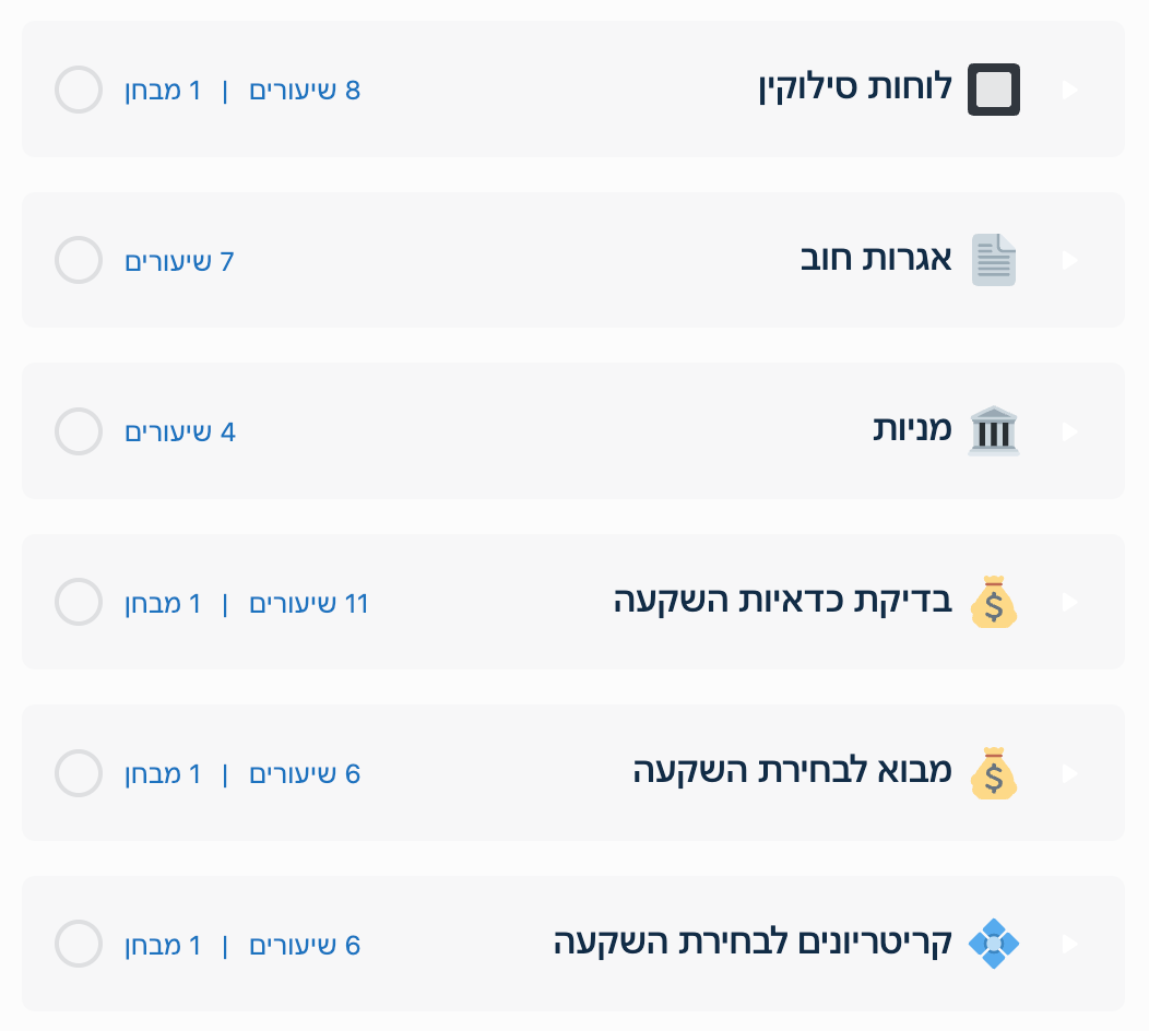 מתוך קורס זה אפשר לצמוח ולהתפתח לנושאים מתקדמים בבדיקת כדאיות השקעה, הערכות שווי של מכשירים פיננסיים וניירות ערך, שוק ההון באופן כללי וכל תחום שבו מנהלים תזרים מזומנים.