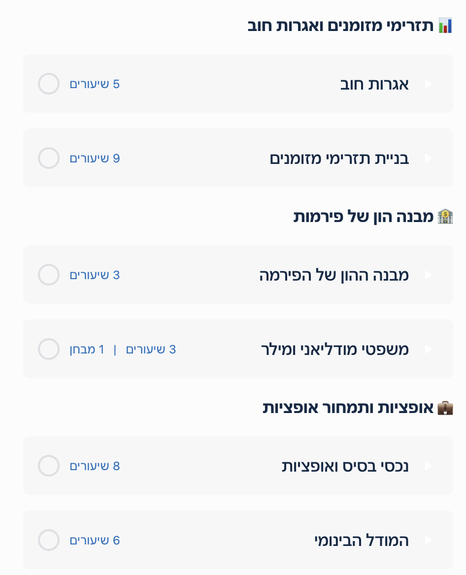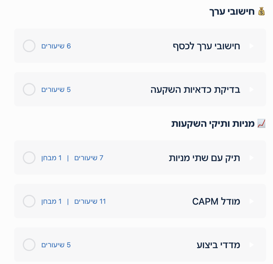 בקורס תקבלו הכנה לבחינה הכוללת סרטוני לימוד ותרגול לנושאי הקורס
