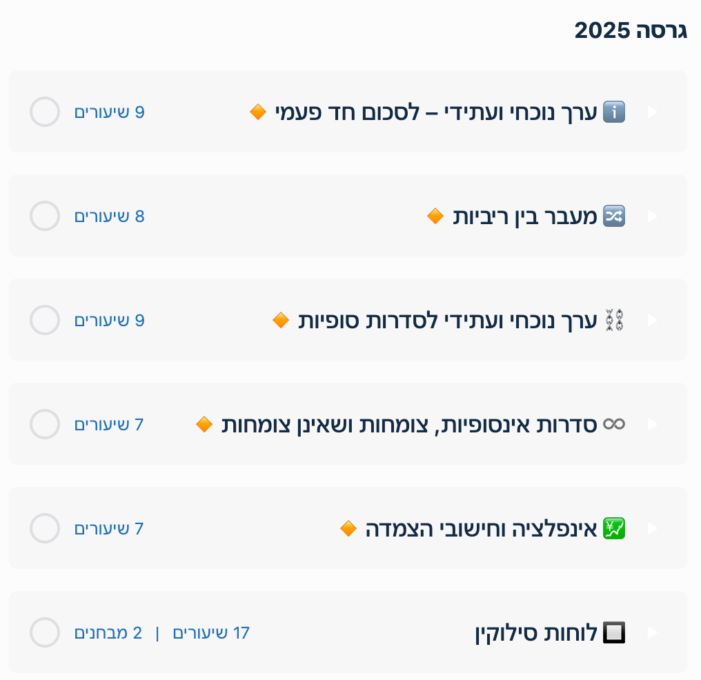 לאחר מכן נלמד על סדרות – סופיות ואינסופיות, קבועות וצומחות.