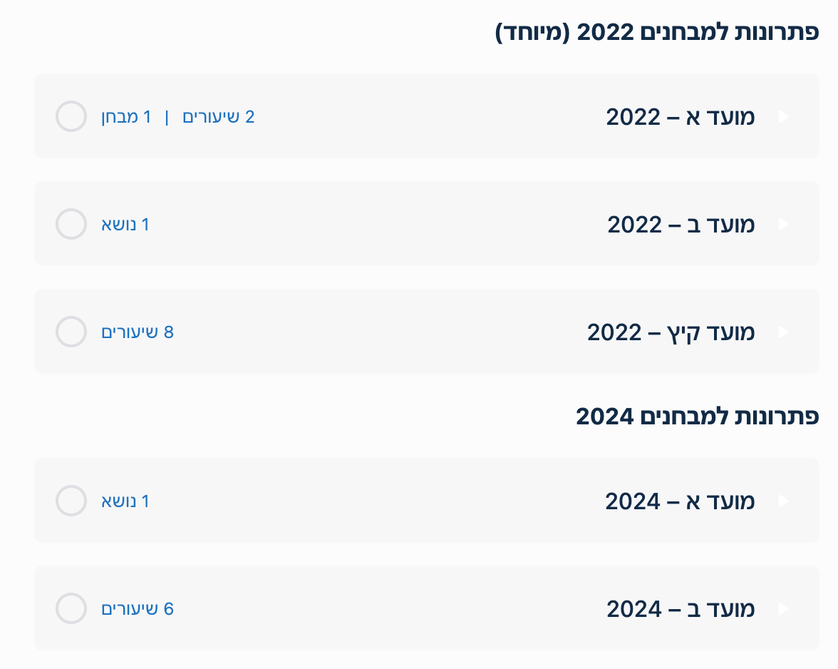 לכל אורך הקורס נלמד את הנושאים וההגדרות בצורה מסודרת ומלאה – לאחר מכן נתרגל שאלות ברמת בחינה – בכל נושא מחכה לכם סימולציית תרגול מקיפה שסוגרת את כל הפינות של החומר.